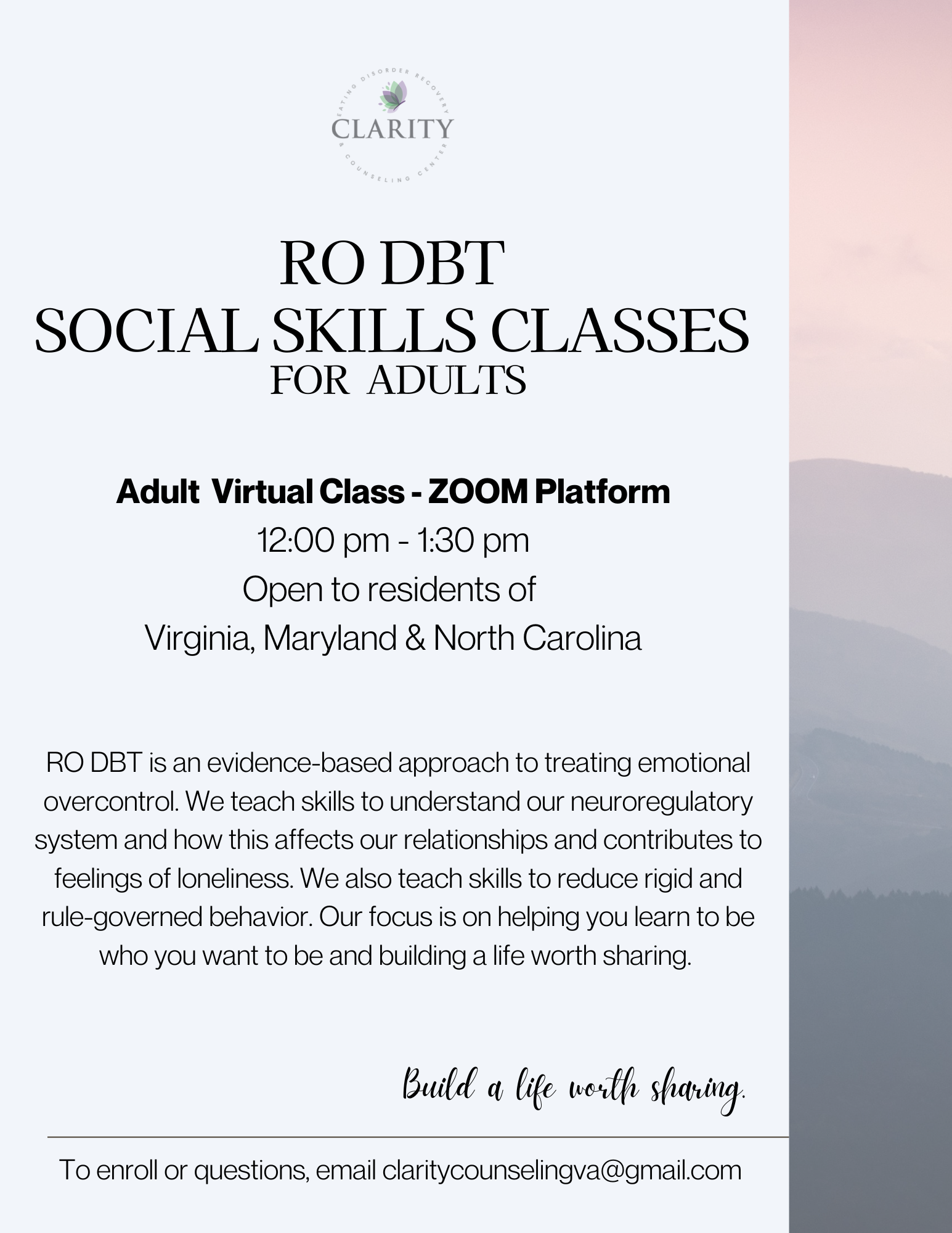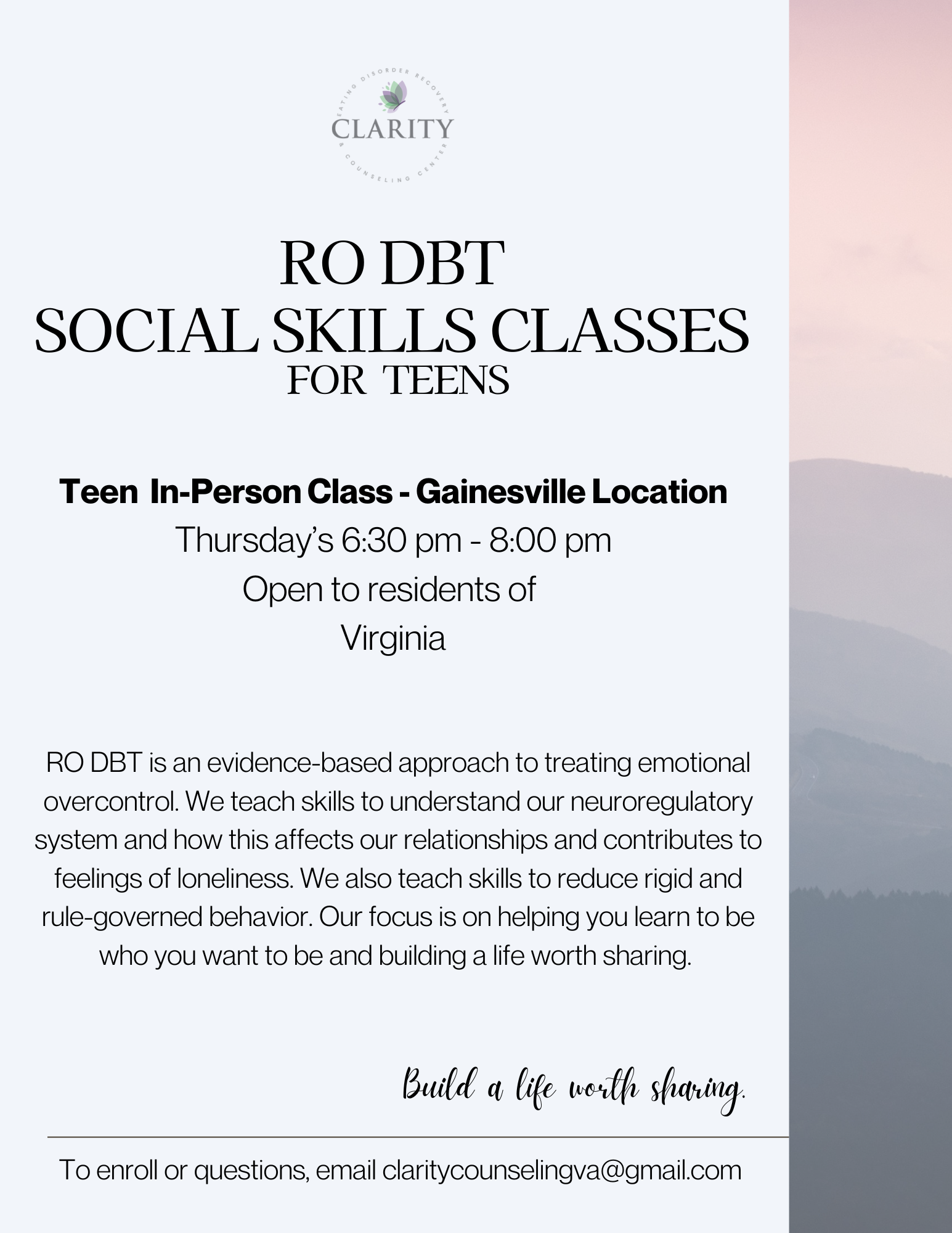 If you'd like to receive an update when an eating disorder support group launches, please email us at claritycounselingva@gmail.com.